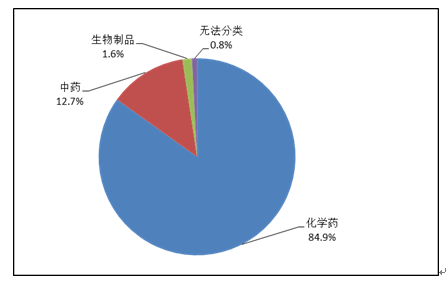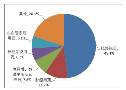 按照藥品類別統(tǒng)計(jì),化學(xué)藥品占86.6%,中藥占12.6%,生物制品占0.8%。化學(xué)藥品排名居前的藥品類別是抗感染藥、心血管系統(tǒng)用藥、腫瘤用藥、神經(jīng)系統(tǒng)用藥、電解質(zhì)、酸堿平衡及營(yíng)養(yǎng)藥;中藥排名居前的藥品類別是理血?jiǎng)⒀a(bǔ)益劑、祛濕劑、開竅劑、清熱劑。