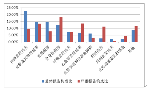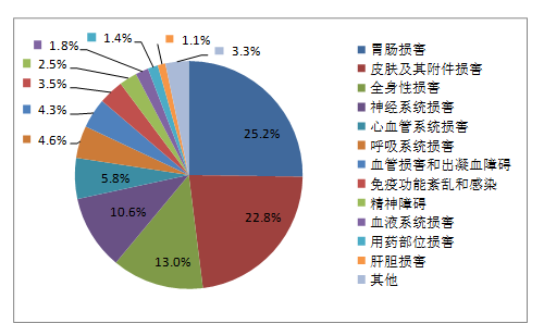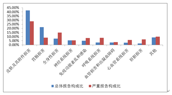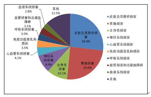 2019年國(guó)家基本藥物化學(xué)藥品和生物制品不良反應(yīng)/事件報(bào)告,按照藥品類別統(tǒng)計(jì),報(bào)告數(shù)量排名前5位的分別是抗微生物藥、心血管系統(tǒng)用藥、抗腫瘤藥、激素及影響內(nèi)分泌藥、治療精神障礙藥;累及器官系統(tǒng)排名前5位的是皮膚及其附件損害、胃腸損害、全身性損害、神經(jīng)系統(tǒng)損害以及血液系統(tǒng)損害。